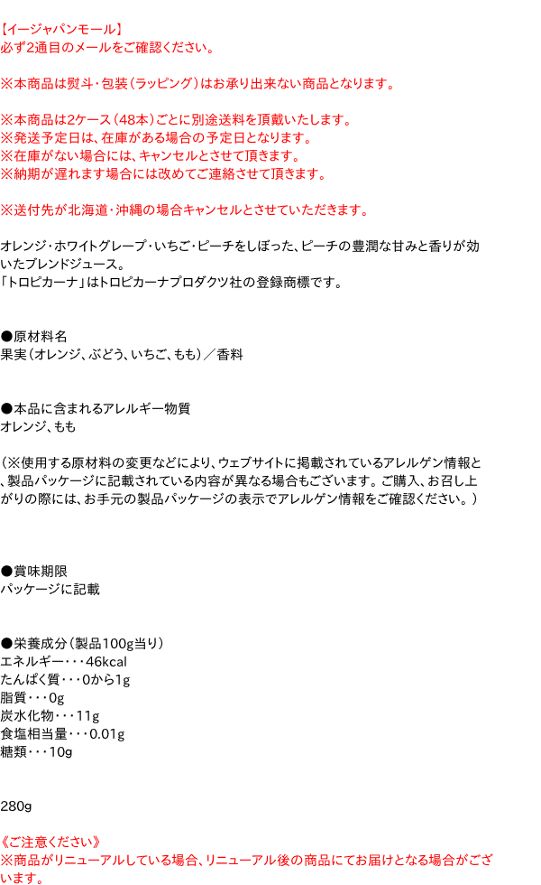 ) ●賞味期限 パッケージに記載 ●栄養成分(製品100g当り) エネルギー・・・46kcal たんぱく質・・・0から1g 脂質・・・0g 炭水化物・・・11g 食塩相当量・・・0.01g 糖類・・・10g 280g【メーカー・製造または販売元】キリンビバレッジ株式会社0120-595955【広告文責】株式会社イージャパンアンドカンパニーズ 072-875-6666《ご注意ください》 ※商品がリニューアルしている場合、リニューアル後の商品をお届けします。